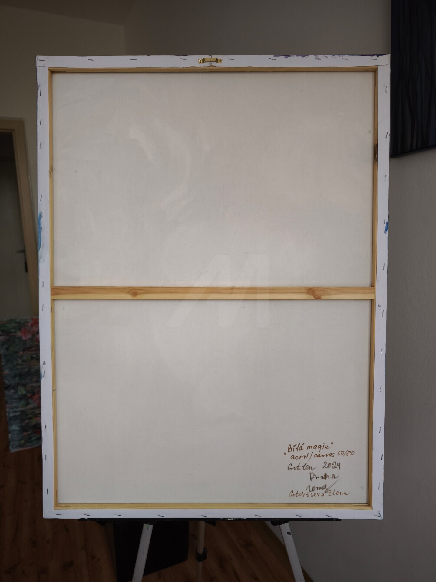 The canvas is gallery-stretched; the edges are painted, allowing the painting to be displayed unframed. The surface is coated with a double layer of water-based satin varnish for UV protection and durability. The artist's signature is on the back. A certificate of authenticity is included.