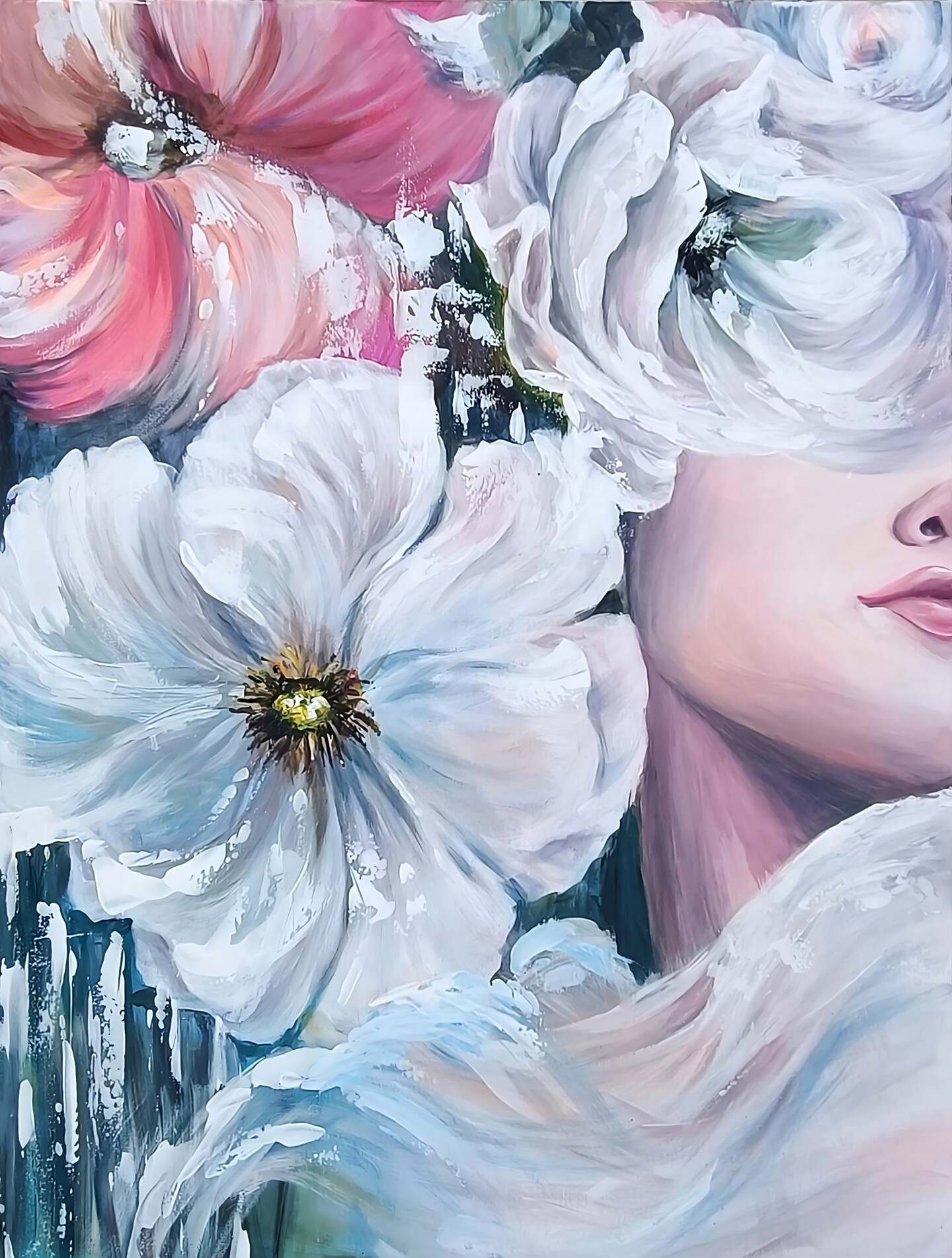 An original, expressive acrylic painting on 100% cotton canvas, measuring 60 x 80 cm (approximately 24 x 32 inches). This contemporary female portrait is a captivating exploration of emotion and color, framed by a riot of floral elements.