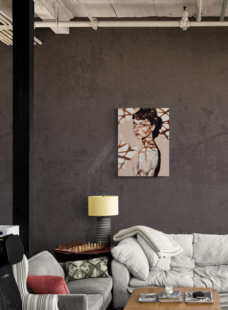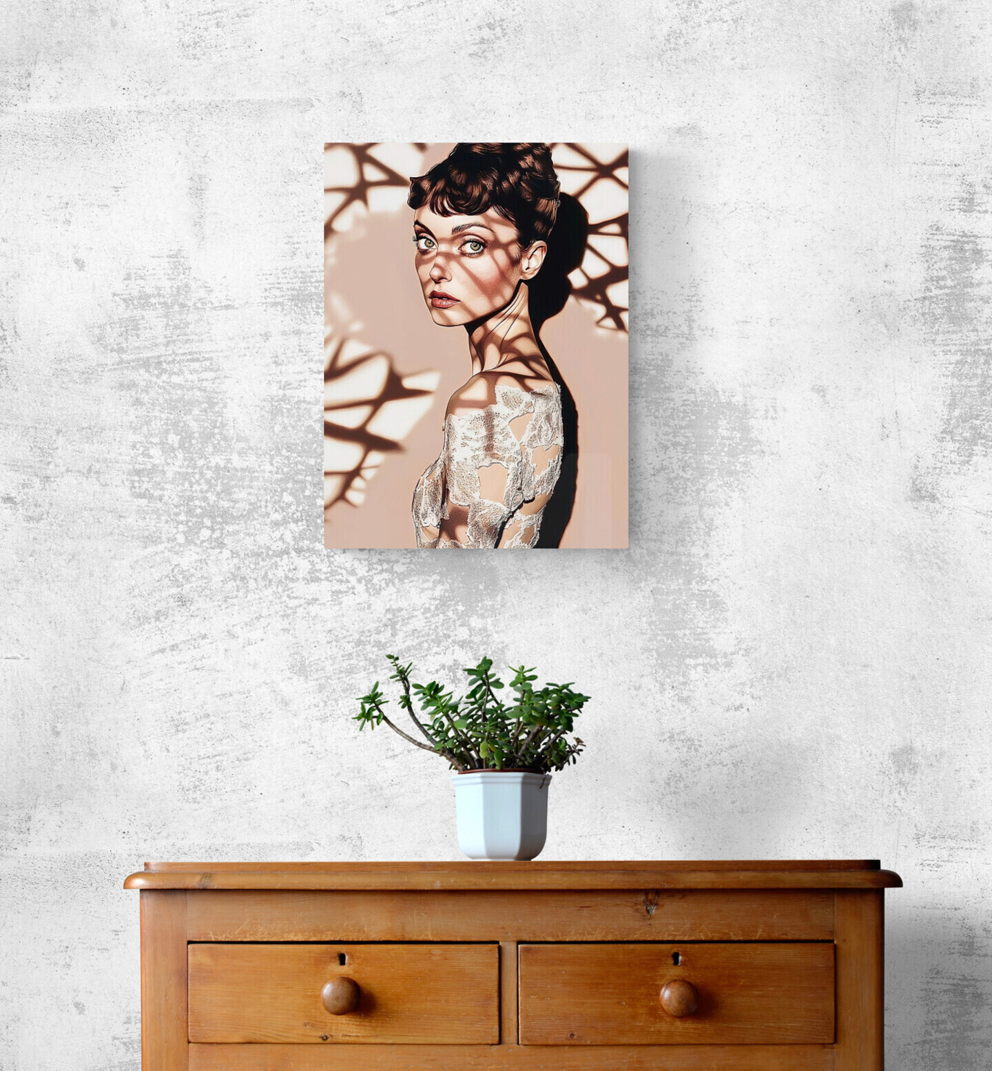 This is a highly detailed digital portrait rendered in a style that blends realism with elements of photorealism and artistic stylization. The core concept of the work is to evoke a sense of mystery and drama through high-contrast lighting. Sharp, graphic shadows, reminiscent of foliage patterns or an ornate lattice, fall across the model's face and body, emphasizing her expressive features and the interplay of light on the white lace gown. The warm, pastel tones of the background and skin lend the piece the feel of a vintage, classic photograph.