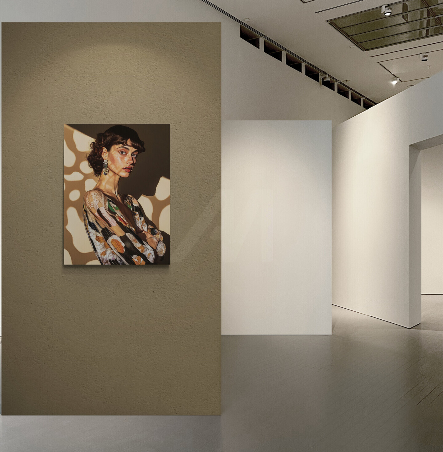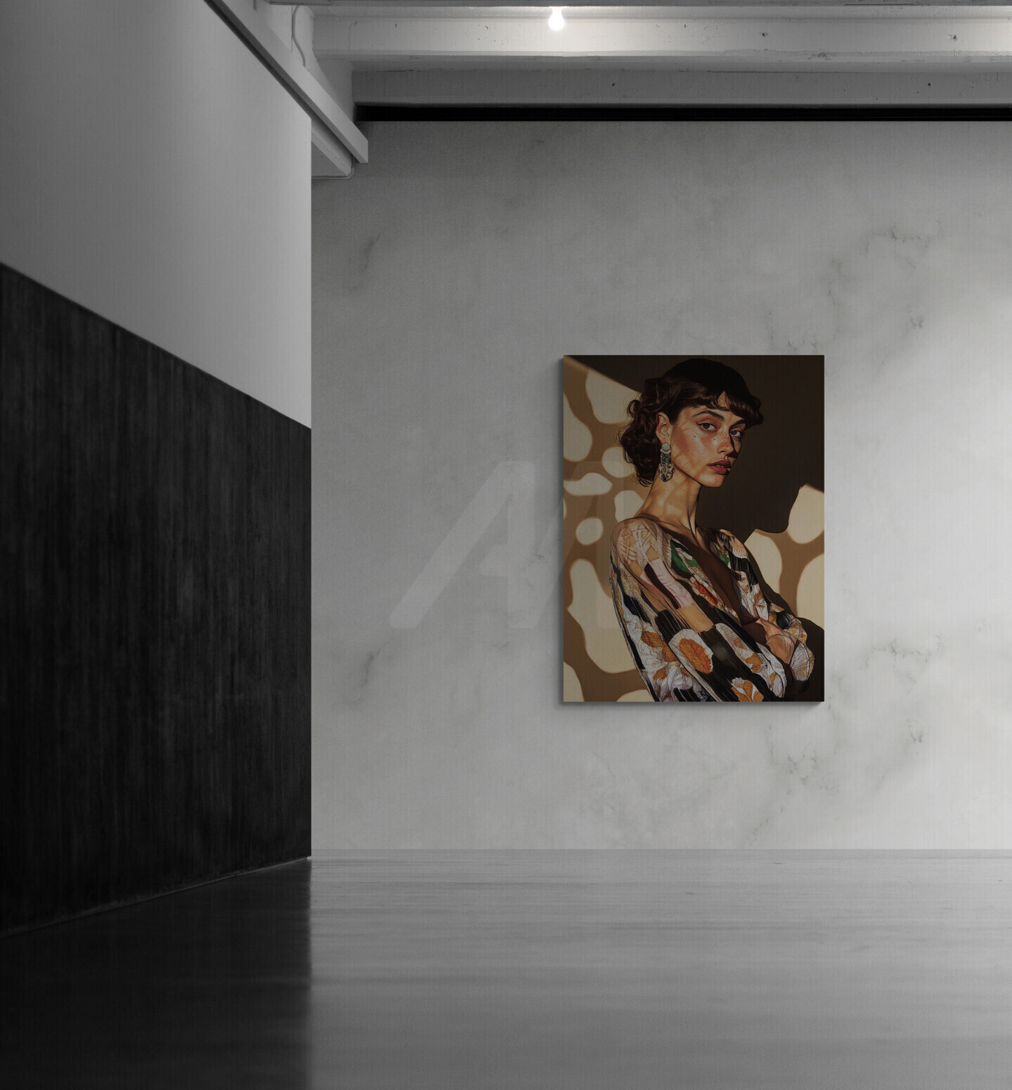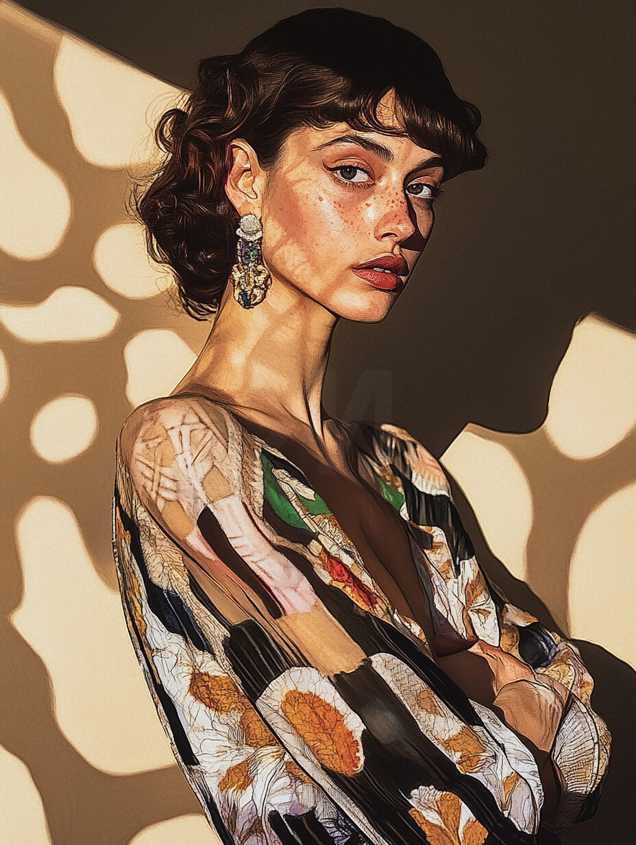 The overall composition and the play of light and shadow create an atmosphere of cinematic quality and mystery, underscoring the interplay of textures and the strong, confident character of the woman depicted.