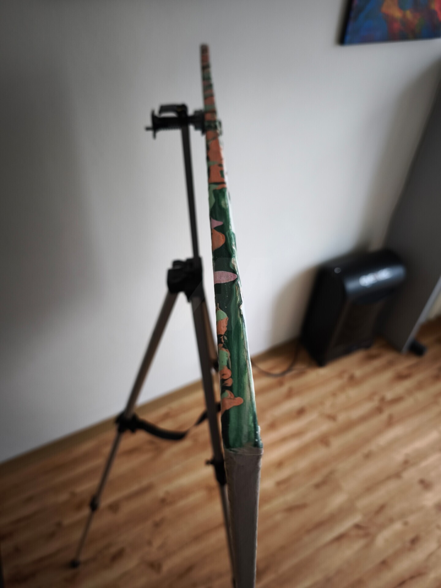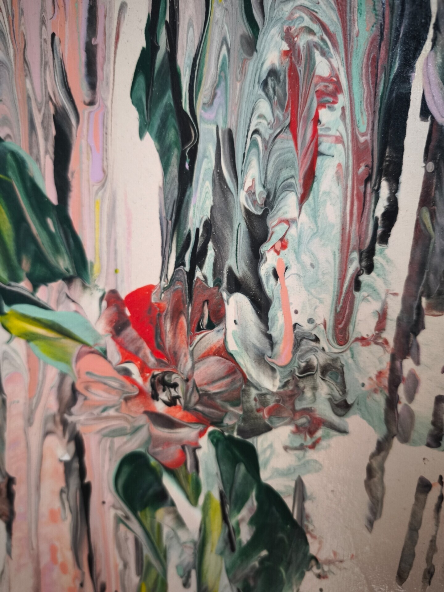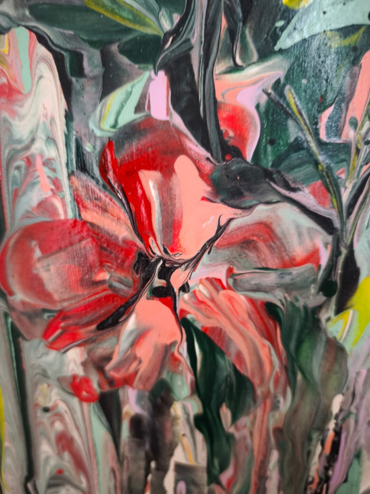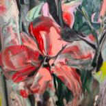 This unique artwork is a mixed-media piece on an 80x60 cm canvas, harmoniously blending natural spontaneity with artistic expression. The background, executed in fluid art, features liquid acrylic flowing freely to form vertical streams reminiscent of a gentle summer rain. The fresh palette of green, blue, pink, white, and yellow blends seamlessly, creating a sense of movement and life. Over this dynamic background, voluminous flower buds were sculpted with a palette knife. The textured strokes give them a vibrant, tangible appearance, contrasting with the fluid lines. The piece conveys lightness, freshness, and tranquility. The combination of abstract expressionism and impasto makes it a vibrant, unique work. Stretched on a wooden frame, it is ready to hang and includes a certificate of authenticity.