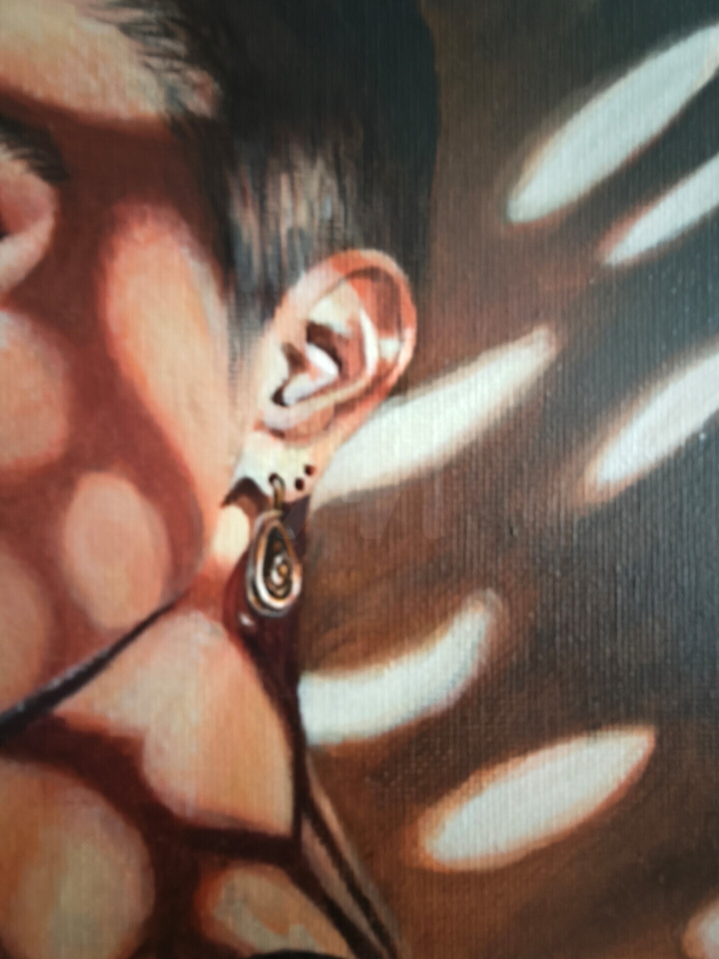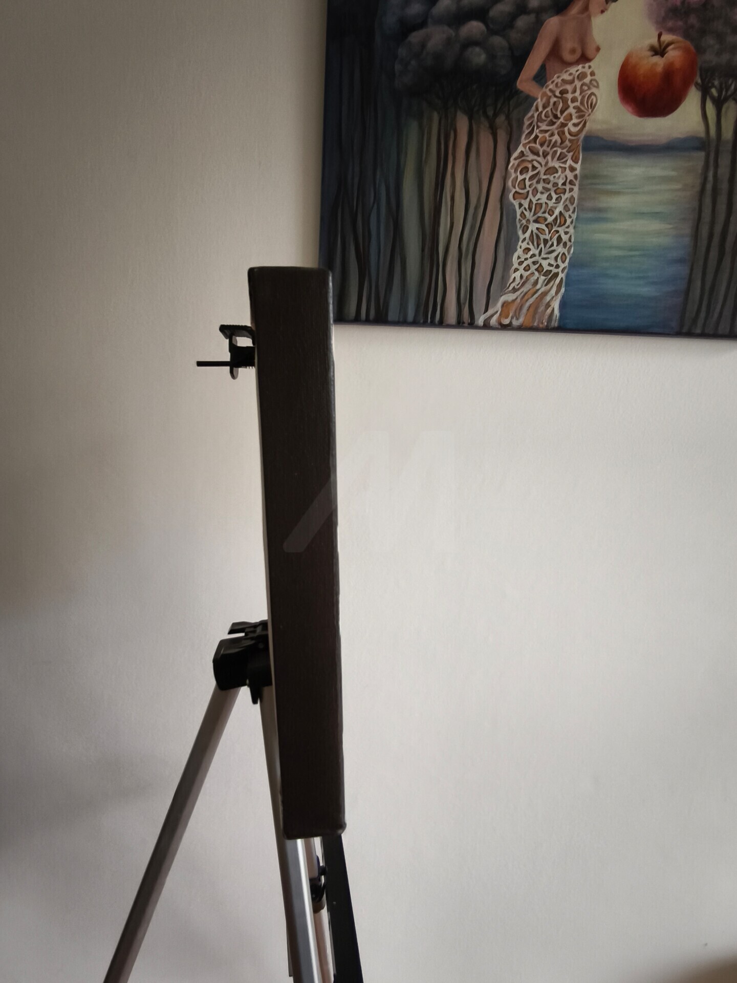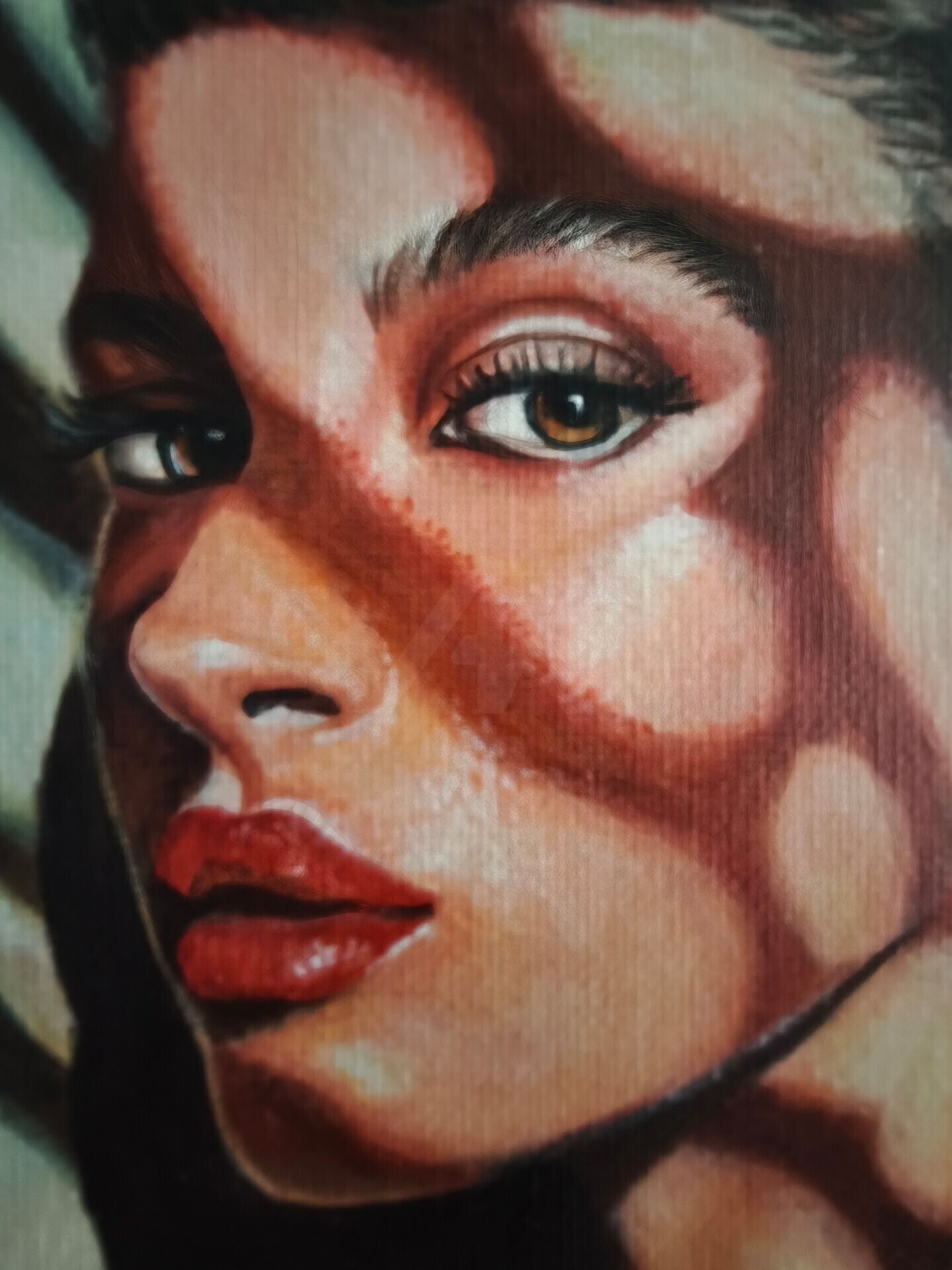 This is an acrylic painting on canvas (29x29 cm) stretched on a subframe. It includes a hanging mount. The painting has the artist's signature and a certificate of authenticity. It is securely packaged and shipped worldwide via Express service with full tracking, arriving within 7–10 days. In this piece, light is not just a background but an active part of the story. The dramatic pattern of light and shadow creates a mysterious mask on the woman's face and figure, emphasizing her strength and independence. This is a portrait of a woman unafraid to shine and be herself. The painting masterfully combines decorative elements with realism, as well as modern boldness with classical sensuality. It will be a powerful addition to any interior, bringing depth, personality, and atmosphere