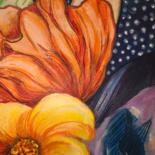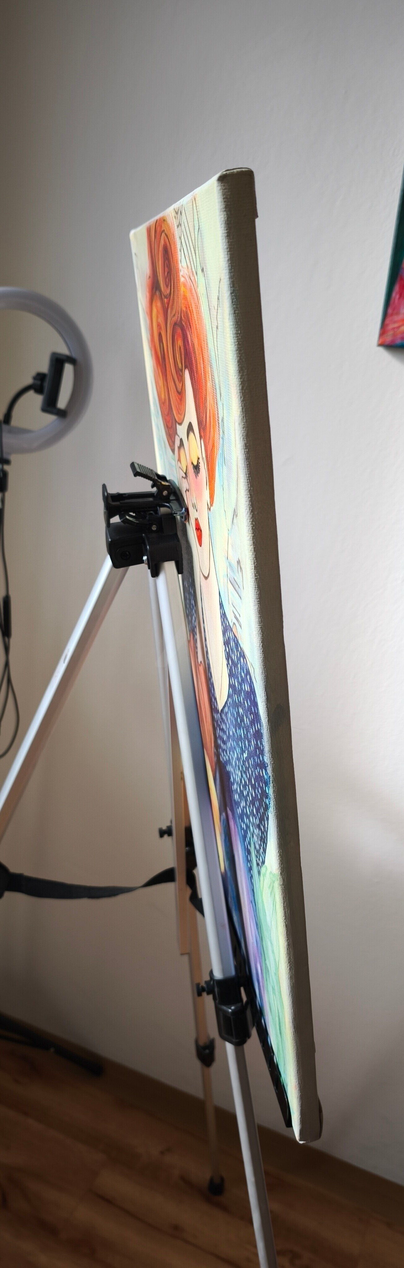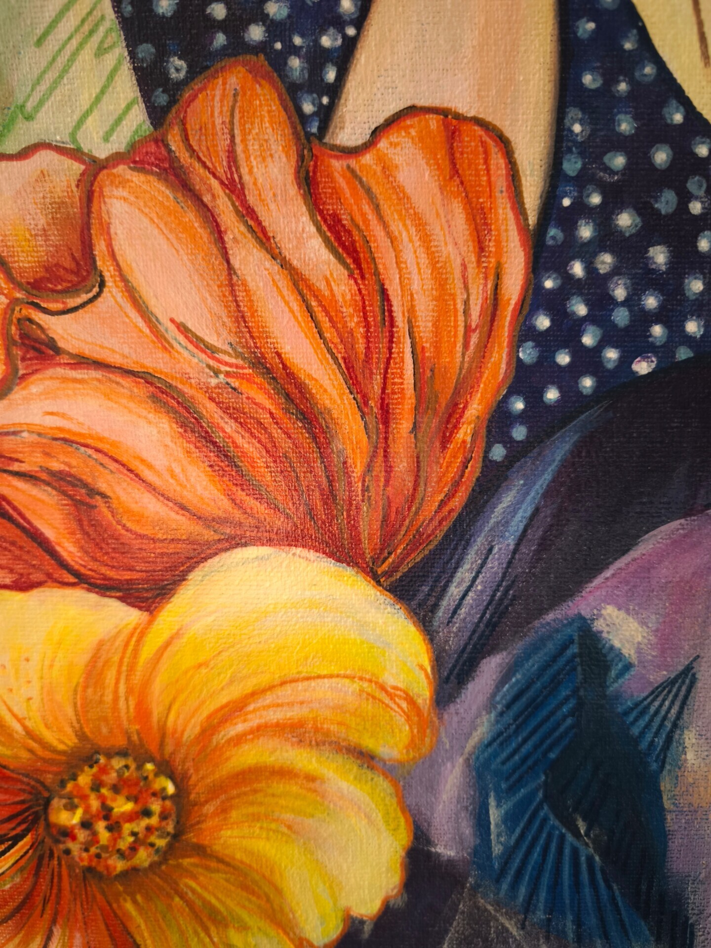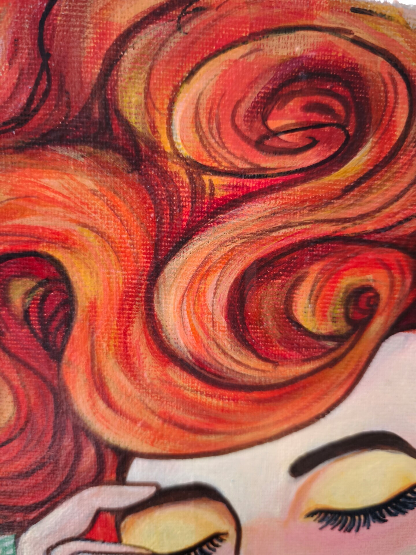 The painting reveals Magdalena's inner world, full of warmth, tenderness, and vivid dreams. Her fiery red hair radiates energy and passion. Her closed eyes invite contemplation, while soft yellow tones on the eyelids and coral-red flowers add a feminine touch. A rich blue dress, strewn like a starry sky, highlights her pensive and harmonious nature.