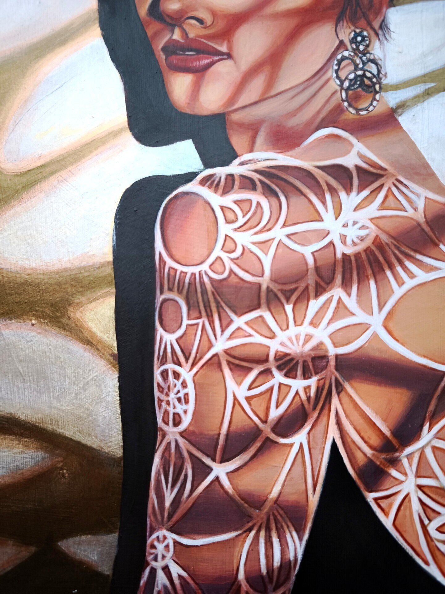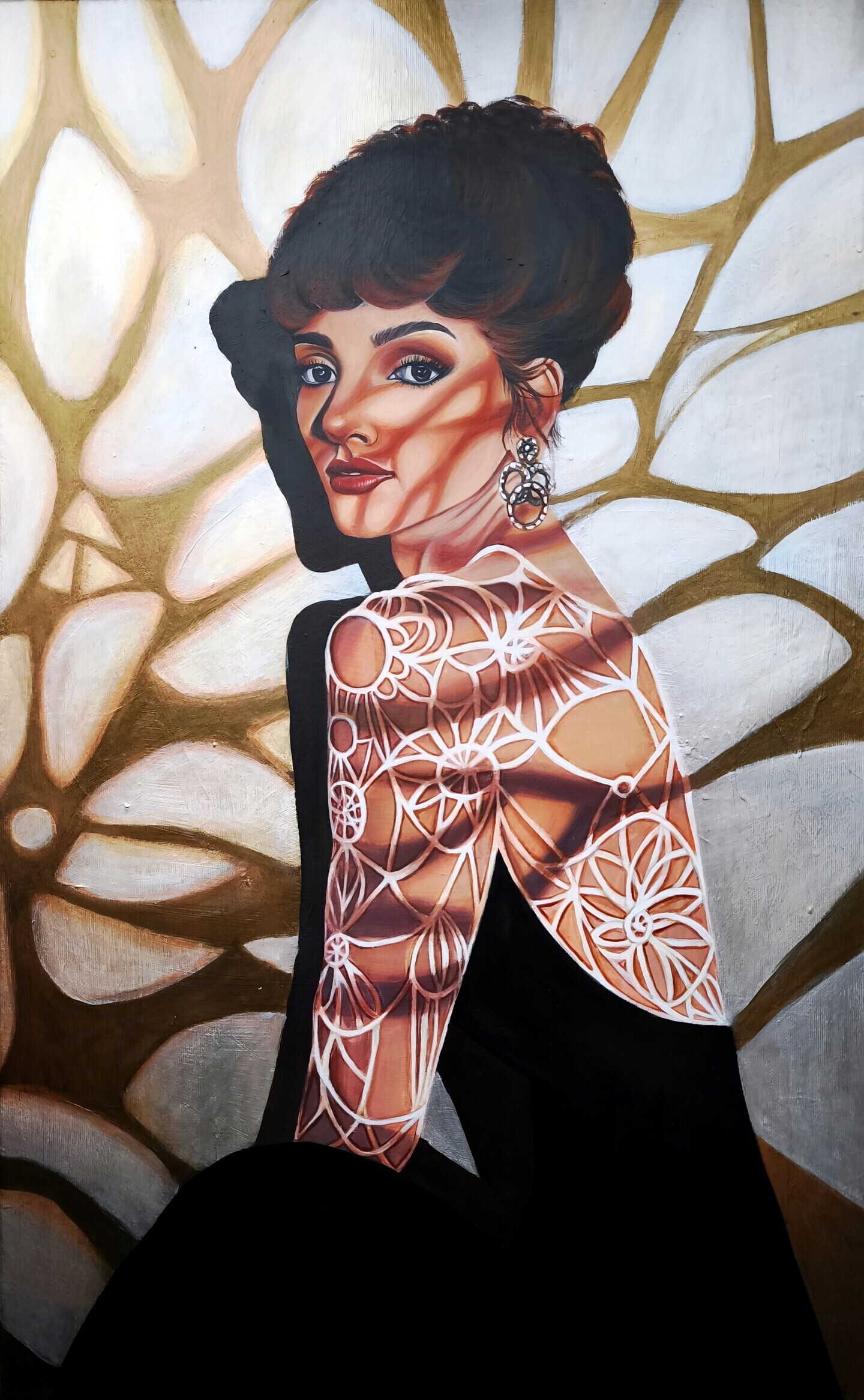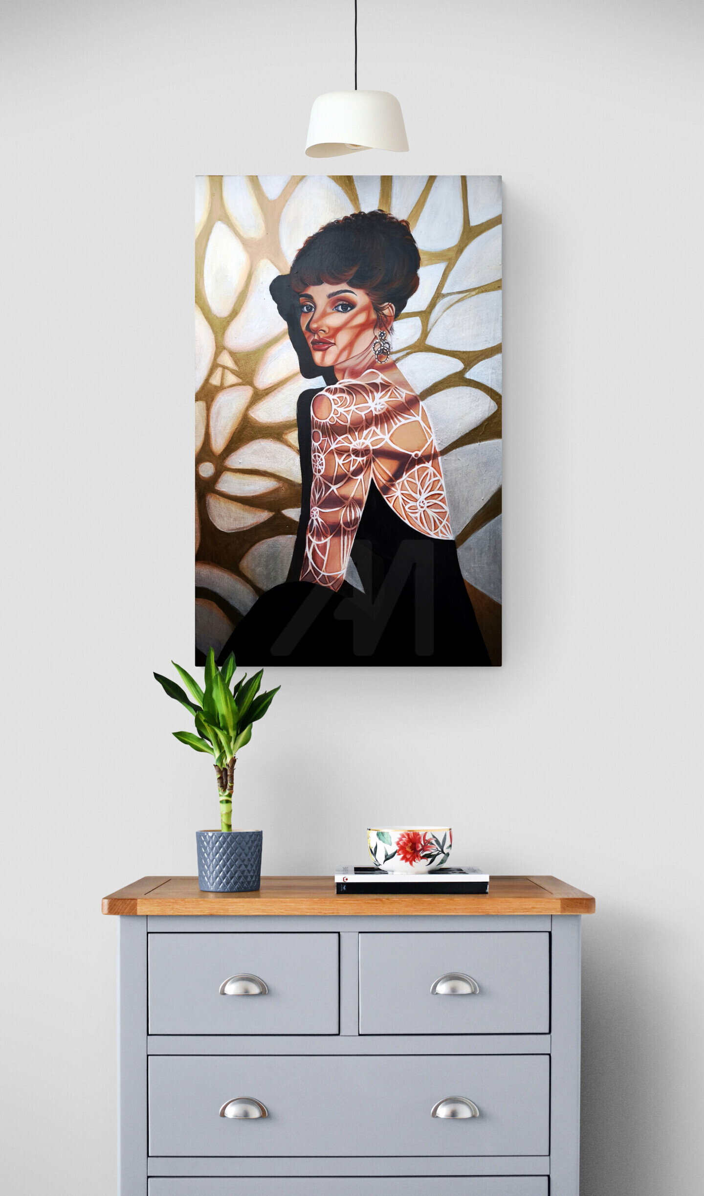 Combining hyperrealisti precision and decorative elegance, this painting is ideal for collectors of contemporary realism and connoisseurs of refined beauty. She harmoniously combines classical technique with a contemporary atmosphere, making it a striking addition to stylish interiors, galleries, or boutiques. Hyperrealisti acrylic painting, portrait of a woman, golden light, lace dress, realistic art, fine art decor, contemporary realism, female figure, elegant portrait, artistic interior.