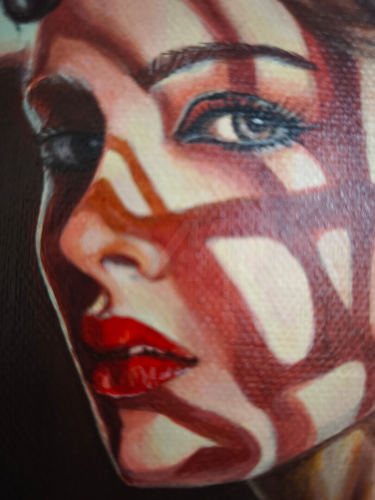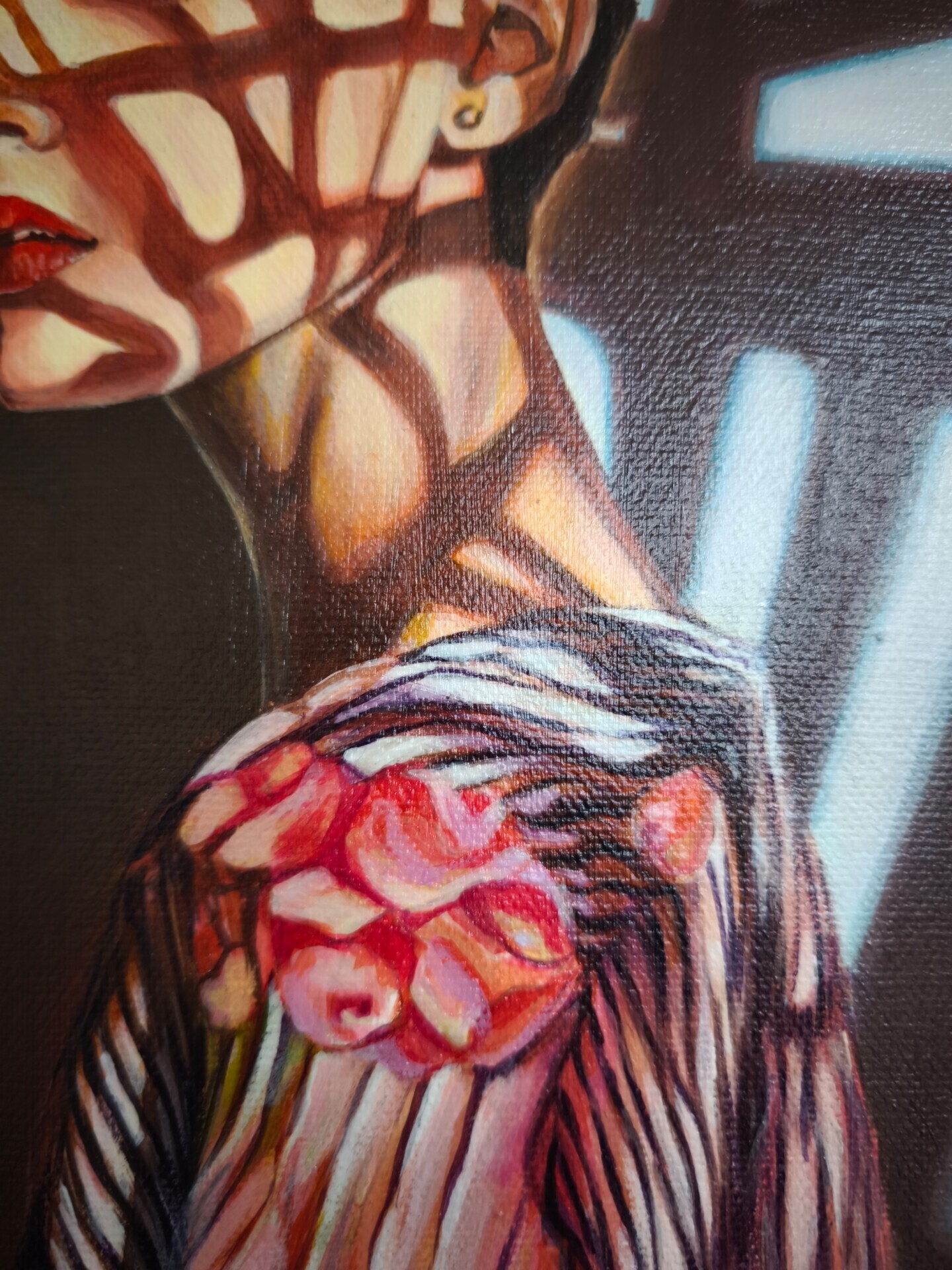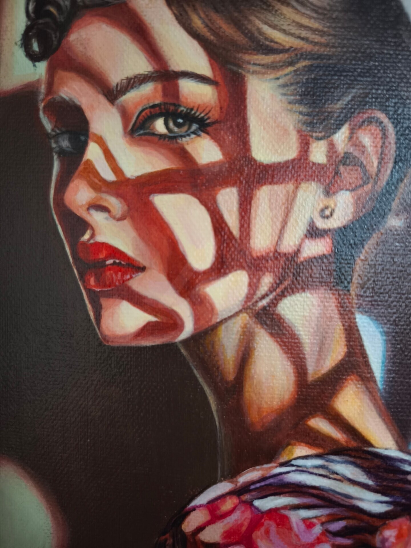 The work combines photorealism with expressionism. It is executed in the glazing technique, which allows for the creation of deep, translucent layers of paint, achieving incredibly subtle transitions. The artist masterfully conveys the interplay of light and shadow: sharp, geometric shadows from a lattice contrast with the soft features of the face, creating a dramatic effect. The sharp shadows can personify life's difficulties that shape a person's personality. The heroine's mysterious gaze and the contrasting lighting create a sense of internal struggle.