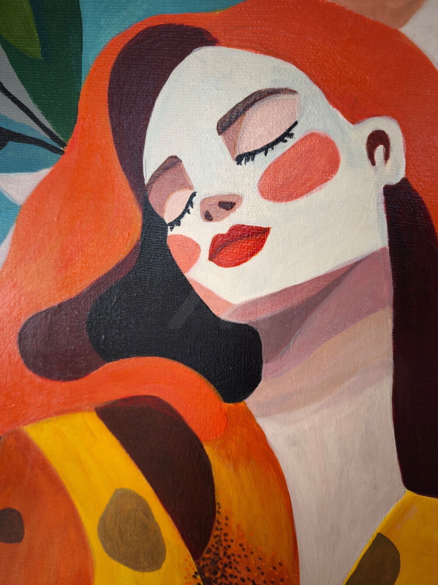 An expressive portrait that celebrates the harmony of feminine beauty and modern art. Inspired by the bold decorative aesthetics of Henri Matisse, the artist depicts a serene red-haired woman surrounded by a kaleidoscope of abstract patterns, flowing shapes, and vibrant colors.