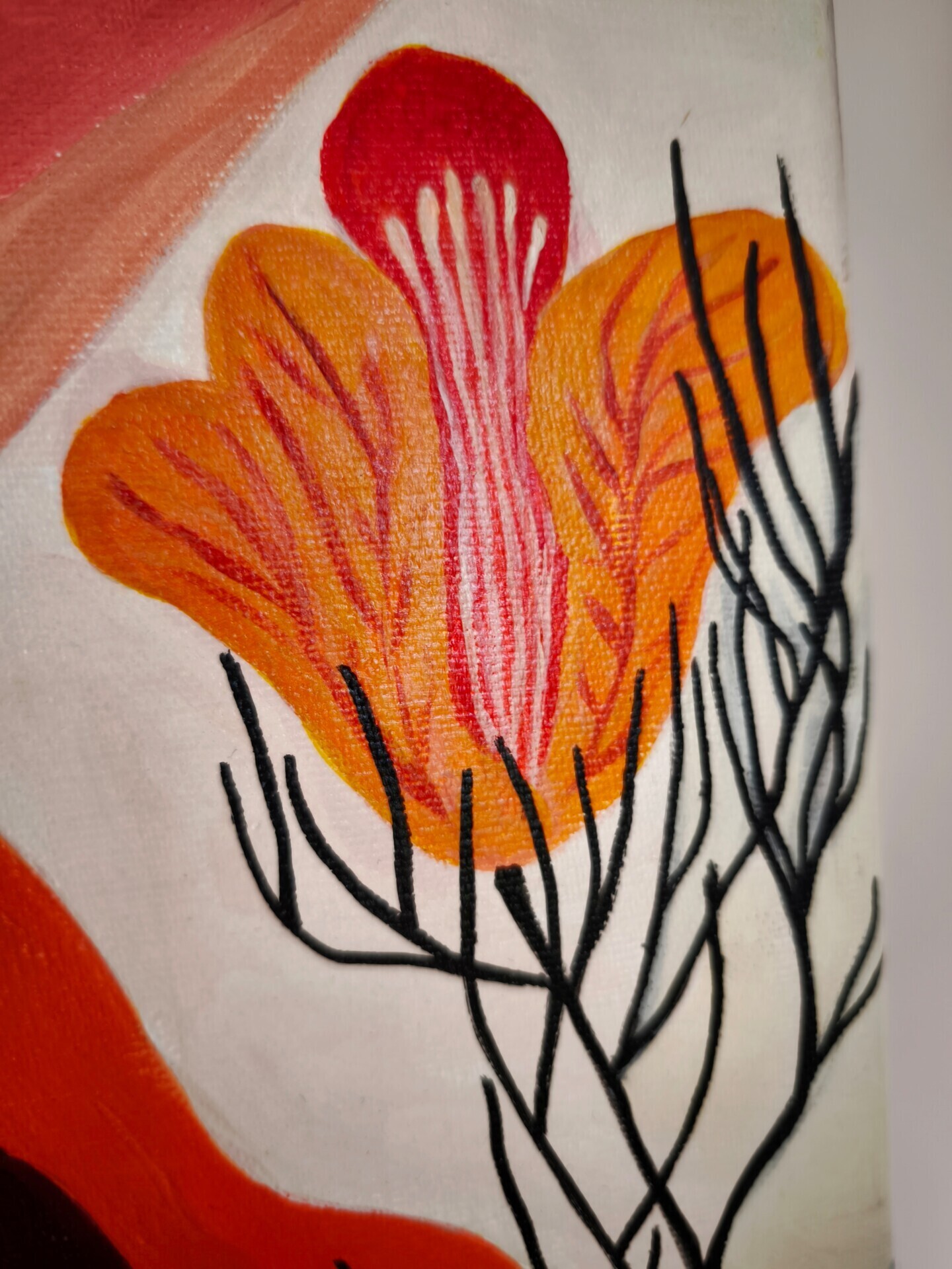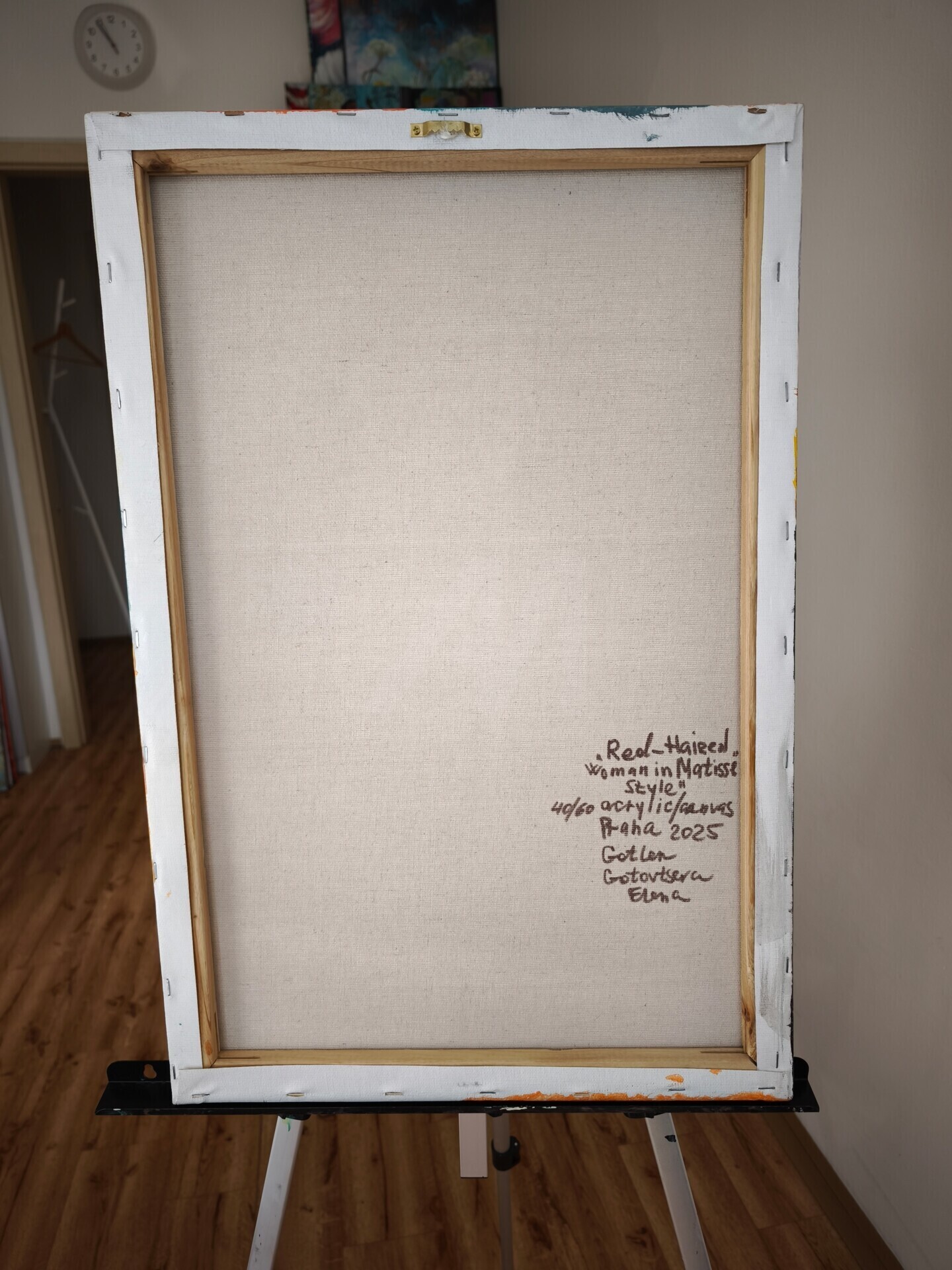The work is painted with acrylic paints on 100% cotton canvas, measuring 40 x 60 cm (1.9 x 1.9 inches). The canvas is stretched on a frame and can be hung on the wall. The edges are painted, allowing the painting to be hung unframed. The surface is coated with a double layer of water-based satin varnish, making it UV-resistant and durable.