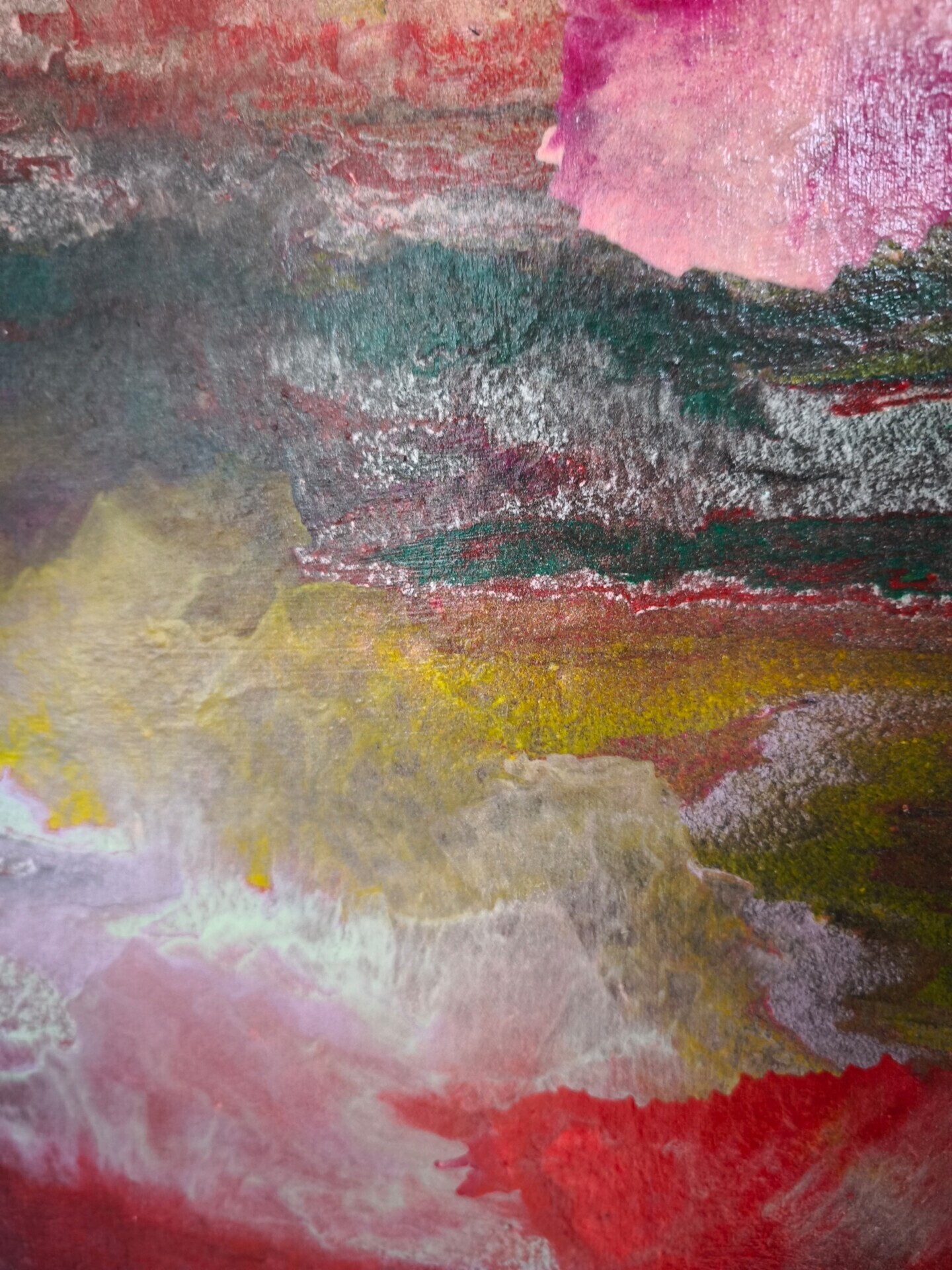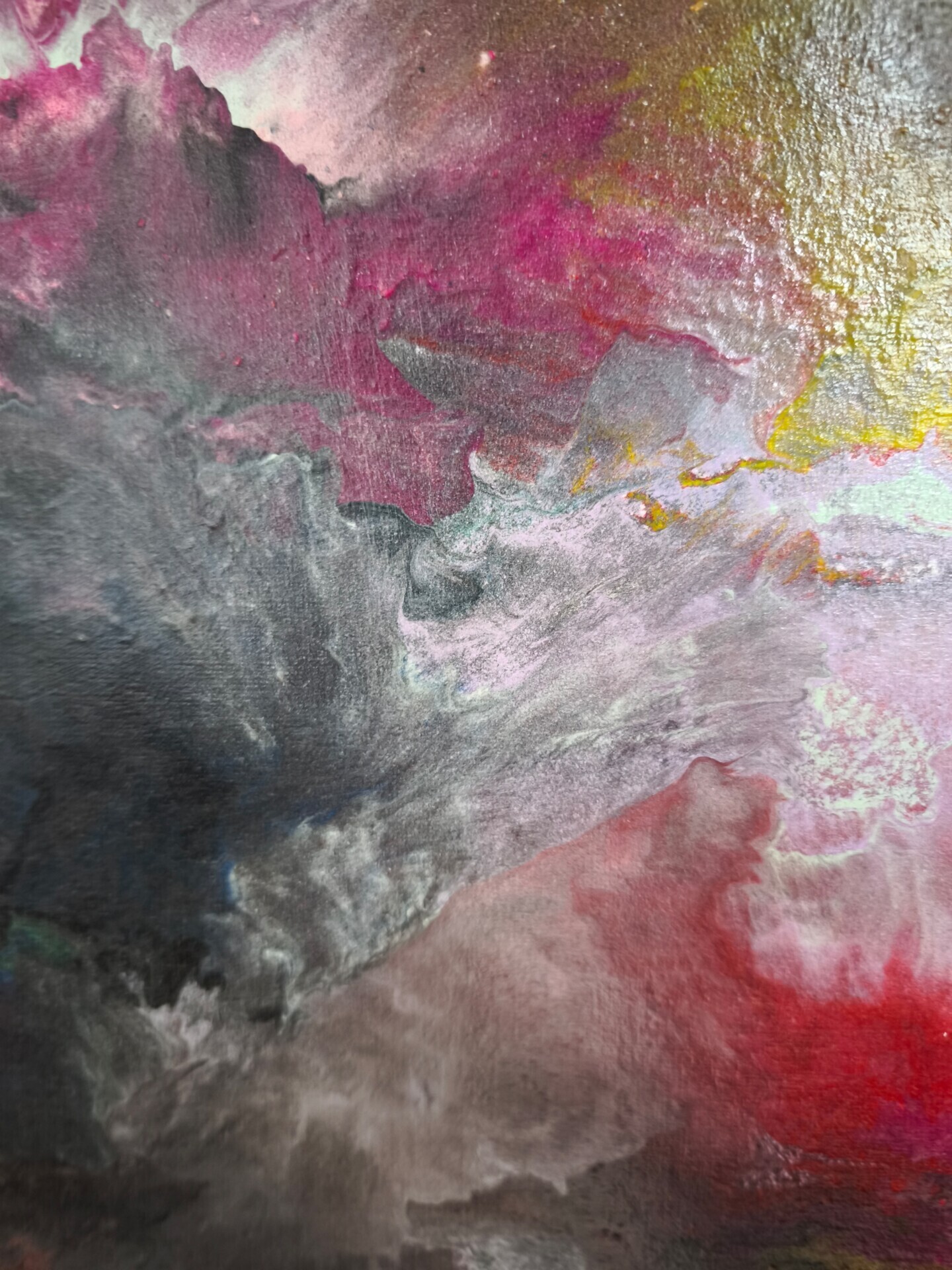The style is notably expressive and dynamic. The vibrant palette features rich shades of pink, magenta, blue, green, yellow, and red. These colors spontaneously overlap, forming complex, multi-layered structures that evoke images of cosmic nebulae, swirling clouds at sunset, or fantastical landscapes. The mood of the painting is bright and emotional, conveying a sense of freedom, spontaneity, and unpredictability, which is beautifully captured in its title.