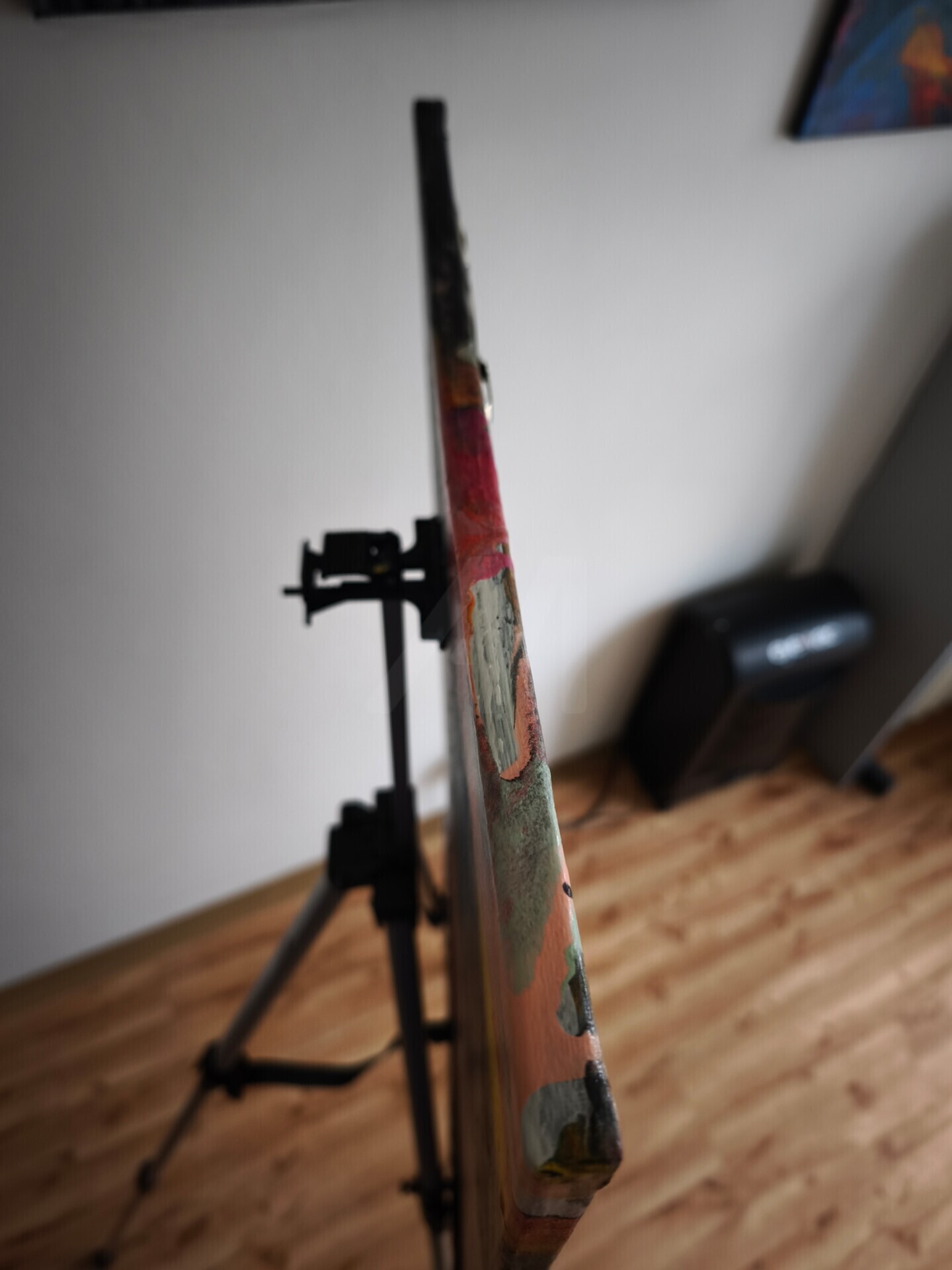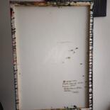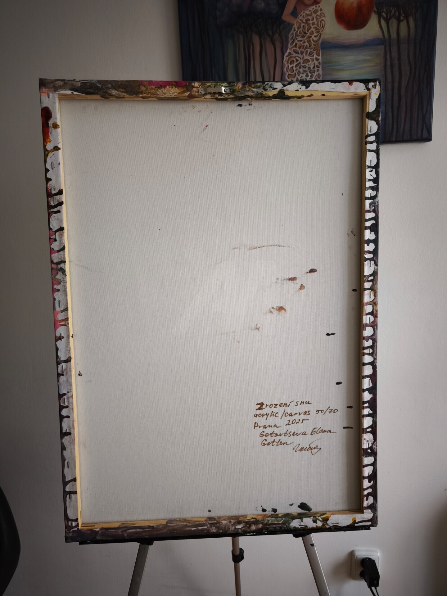 The canvas measures 50 by 70 cm. It is stretched on a sturdy wooden subframe and includes mounting hardware for easy wall display. The artist’s signature is located on the back of the piece, and it comes with a certificate of authenticity, confirming its unique status.